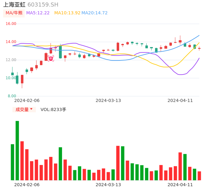 04月11日,上海亚虹收报13.30,股价涨幅0.45%,成交金额1095.25万元,换手率0.59%。