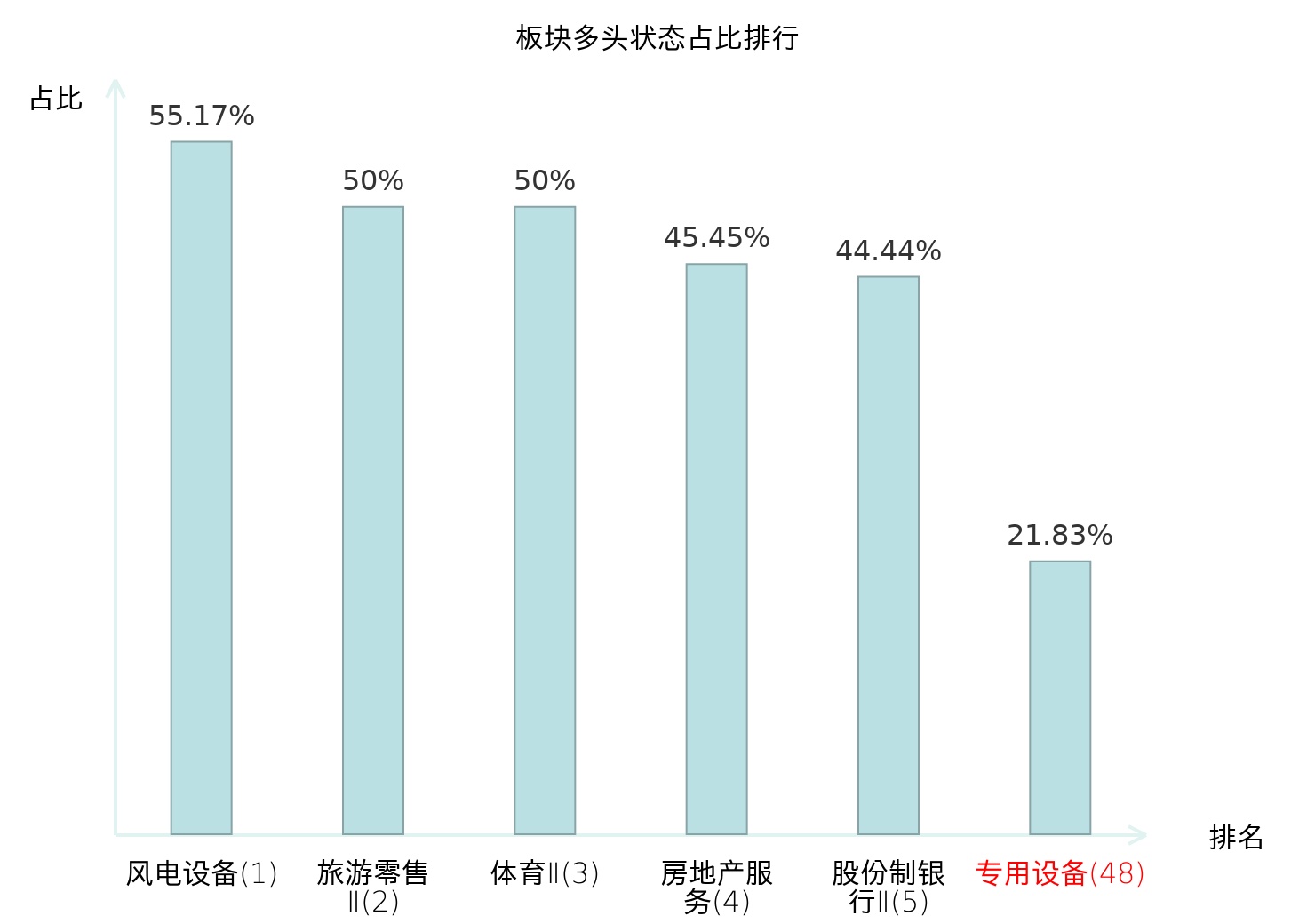 全市场所有行业板块中主力多头状态占比排名中,风电设备板块位居第一。保险Ⅱ板块名次提升最快,较昨日上升64位。