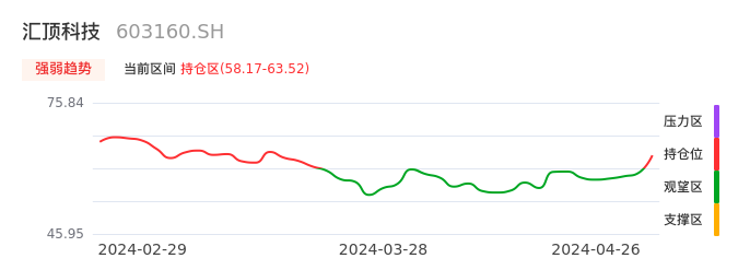 我们来看一下该股的九方特色指标强弱趋势的情况:汇顶科技近日从观望区上穿到持仓区。股价短期站稳多头区域,上升动能仍较为充足,可积极关注。后续重点关注上方压力位:63.52元是否能突破上攻。