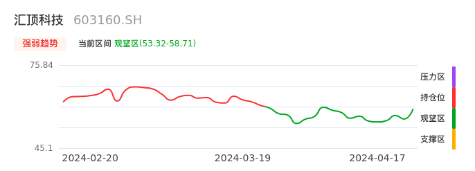 我们来看一下该股的九方特色指标强弱趋势的情况:汇顶科技自03月22日从持仓区下穿到观望区。股价近期持续下跌后,短期出现止跌迹象。后续重点关注能否再次站上多空分界点:58.71元。如未能有效突破则可能进入新一轮空头行情。