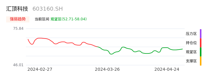 我们来看一下该股的九方特色指标强弱趋势的情况:汇顶科技自03月22日从持仓区下穿到观望区。股价近期持续下跌后,短期出现止跌迹象。后续重点关注能否再次站上多空分界点:58.04元。如未能有效突破则可能进入新一轮空头行情。