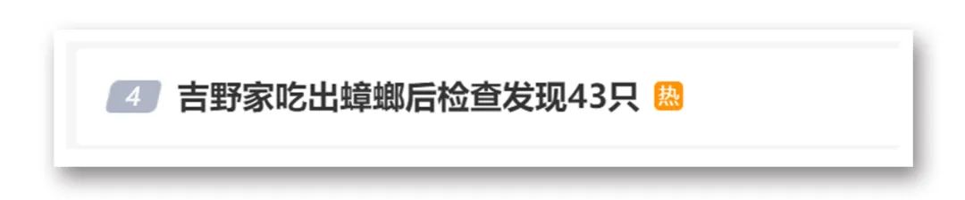 “吉野家吃出蟑螂后检查发现43只”今日冲上微博热搜。