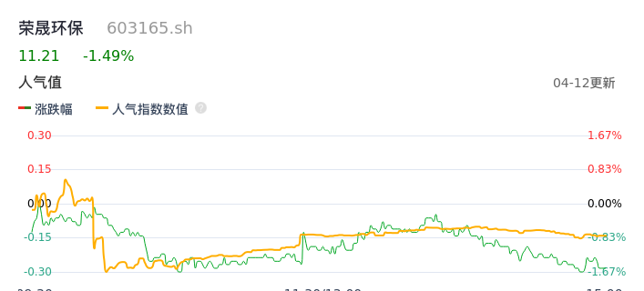 04月12日,荣晟环保收报11.21,股价涨幅-1.49%,成交金额3575.11万元,换手率1.14%。