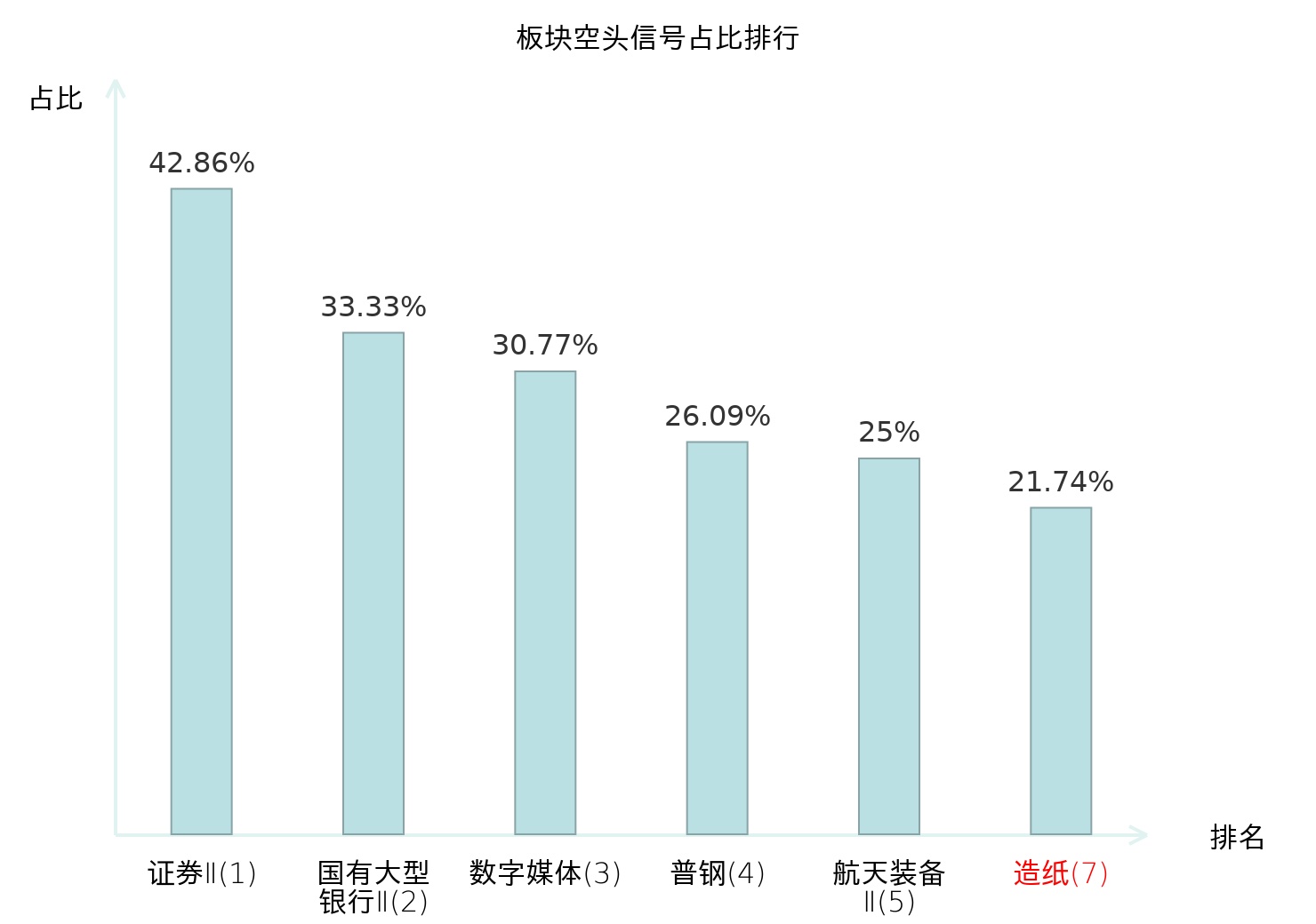 全市场所有行业板块中主力空头信号占比排名中,证券Ⅱ板块位居第一。证券Ⅱ板块名次提升最快,较昨日上升127位。