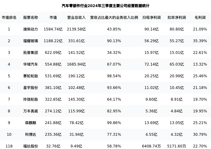 福达股份最新报告期数据为三季度,下表汇总了汽车零部件行业内市值靠前的公司三季度主要经营数据