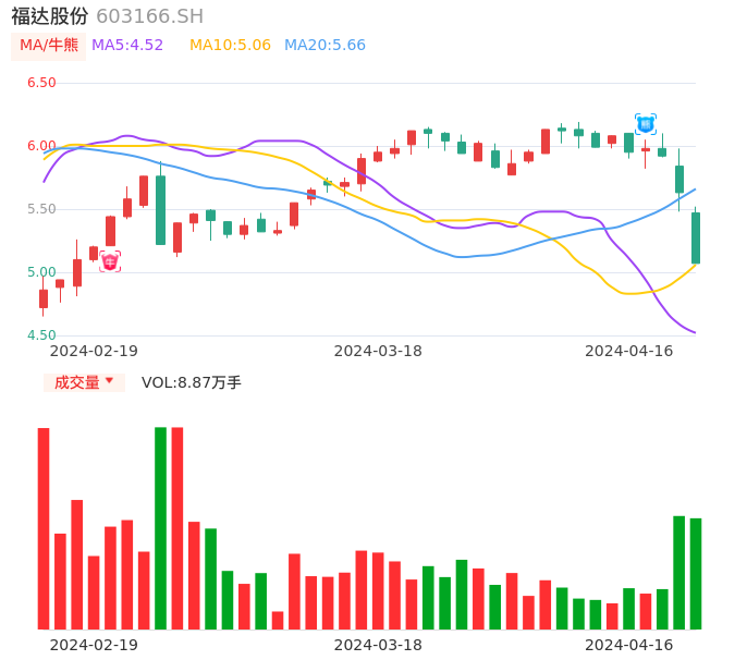 04月16日,福达股份收报5.07,股价涨幅-9.95%,成交金额4583.14万元,换手率1.37%。