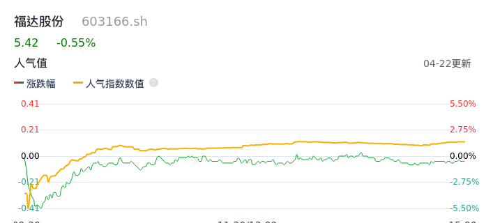 04月22日,福达股份收报5.42,股价涨幅-0.55%,成交金额3922.14万元,换手率1.13%。