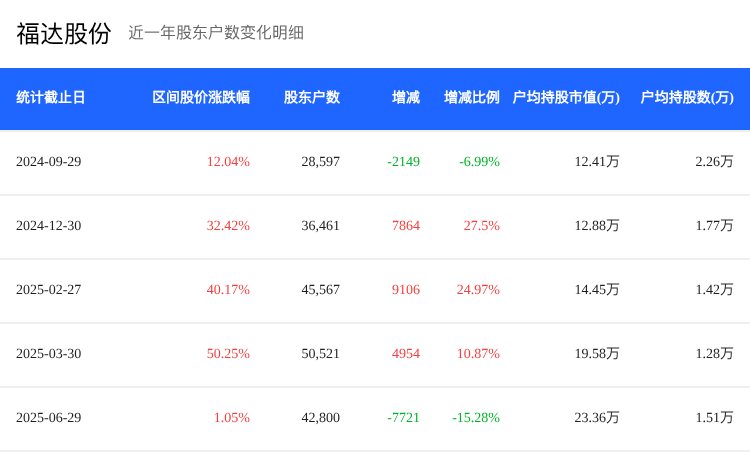 结合本期股东户数的减少和量价表现的低迷,可以推测这一变化的原因可能是市场对福达股份的未来表现存在分歧,部分股东选择离场,而留下的投资者则倾向于长期持有,导致股东户数减少,户均持股数和市值增加。此现象可能反映了市场对公司基本面或行业前景的不确定性增加,部分投资者选择观望或退出。