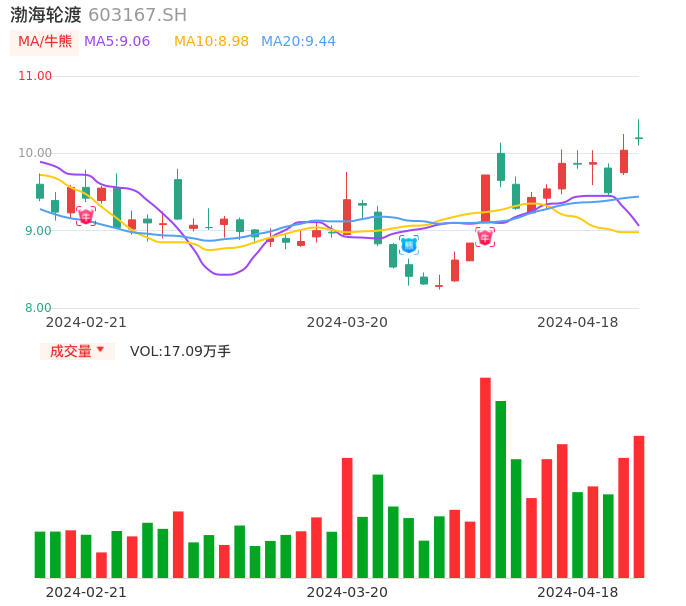 04月18日,渤海轮渡收报10.19,股价涨幅1.49%,成交金额1.75亿元,换手率3.64%。