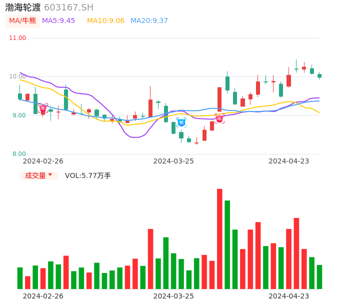04月23日,渤海轮渡收报9.98,股价涨幅-0.99%,成交金额5769.11万元,换手率1.23%。