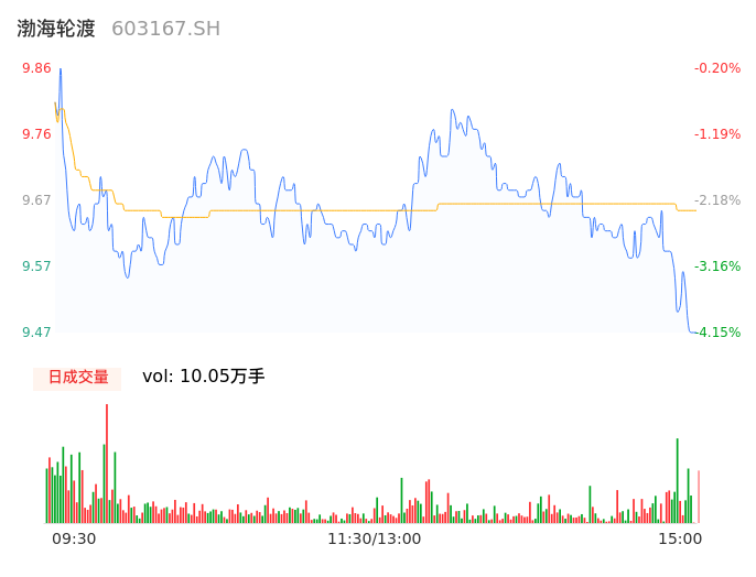 04月16日,渤海轮渡收报9.49,股价涨幅-3.95%,成交金额9696.85万元,换手率2.14%。
