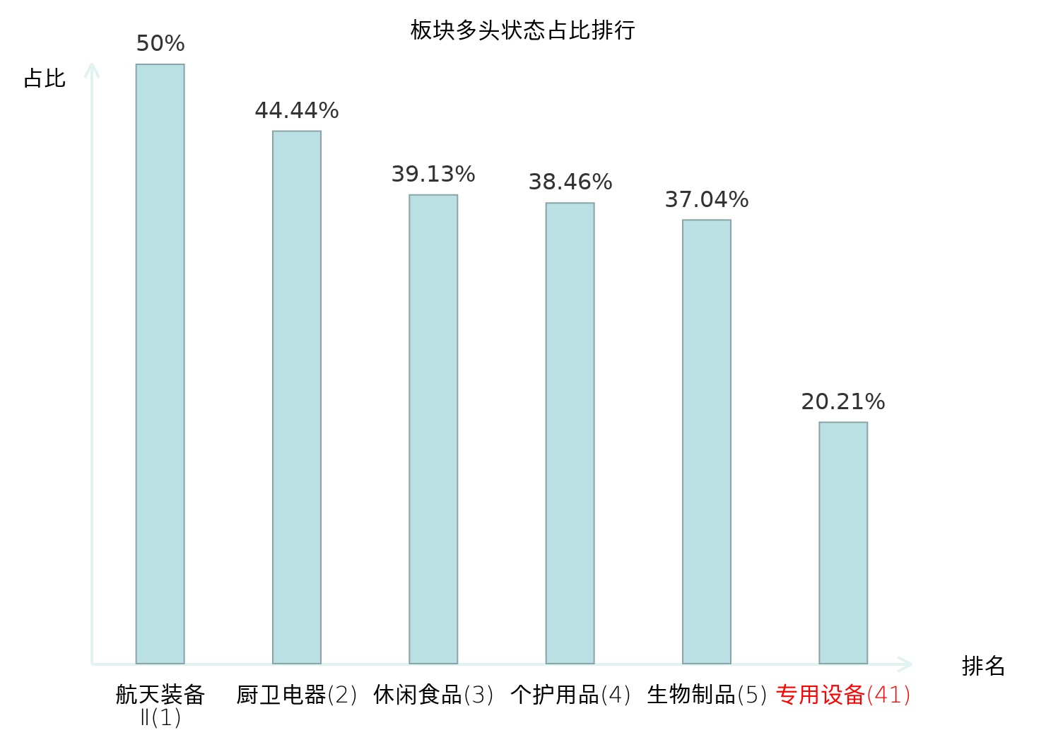 全市场所有行业板块中主力多头状态占比排名中,航天装备Ⅱ板块位居第一。小金属板块名次提升最快,较昨日上升53位。