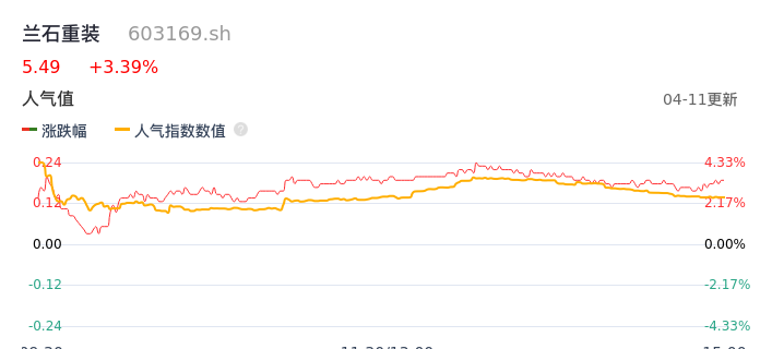 04月11日,兰石重装收报5.49,股价涨幅3.39%,成交金额1.12亿元,换手率1.56%。