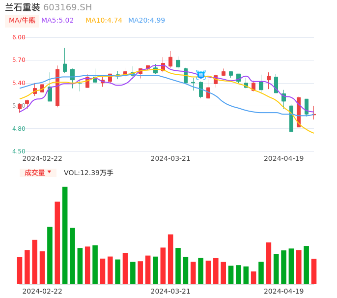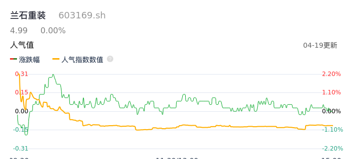 04月19日,兰石重装收报4.99,股价涨幅0.00%,成交金额6213.76万元,换手率0.95%。