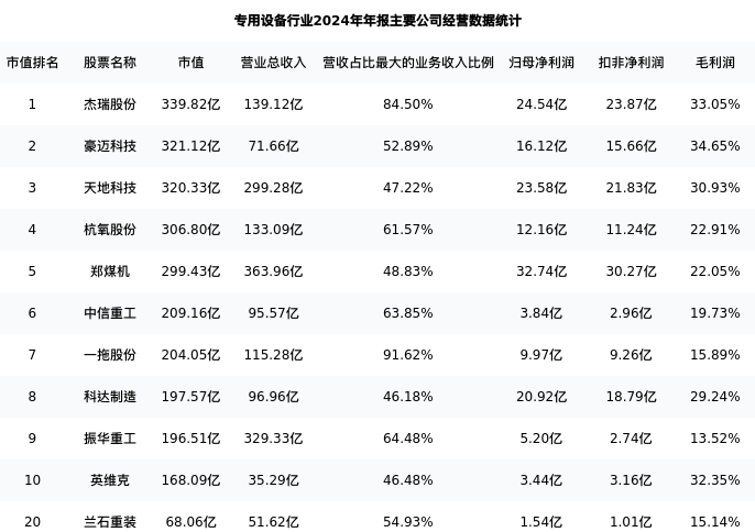 兰石重装最新报告期数据为年报,下表汇总了专用设备行业内市值靠前的公司年报主要经营数据