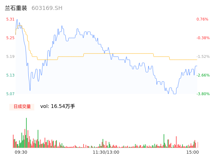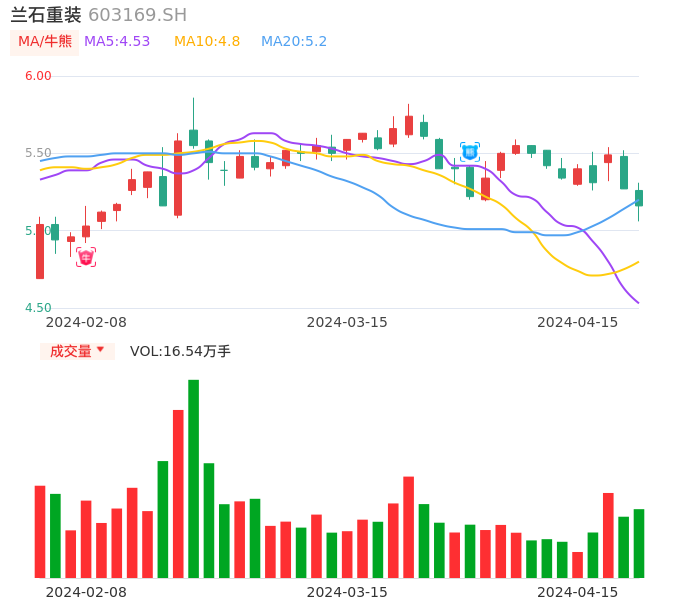 04月15日,兰石重装收报5.16,股价涨幅-2.09%,成交金额8562.69万元,换手率1.27%。