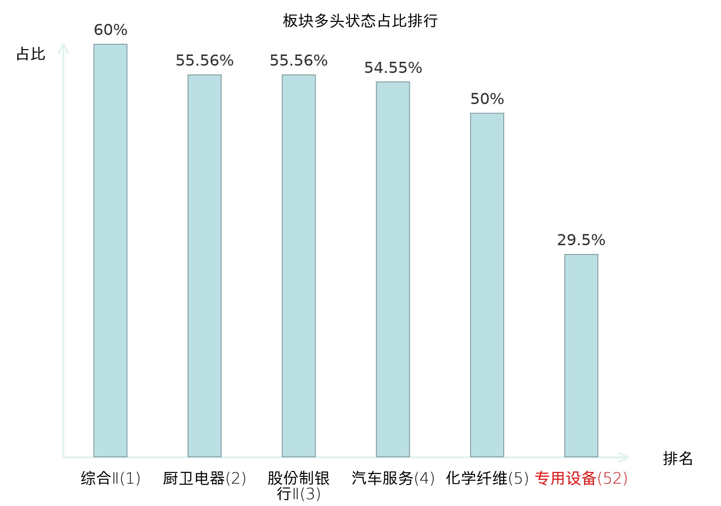 全市场所有行业板块中主力多头状态占比排名中,综合Ⅱ板块位居第一。出版板块名次提升最快,较昨日上升55位。
