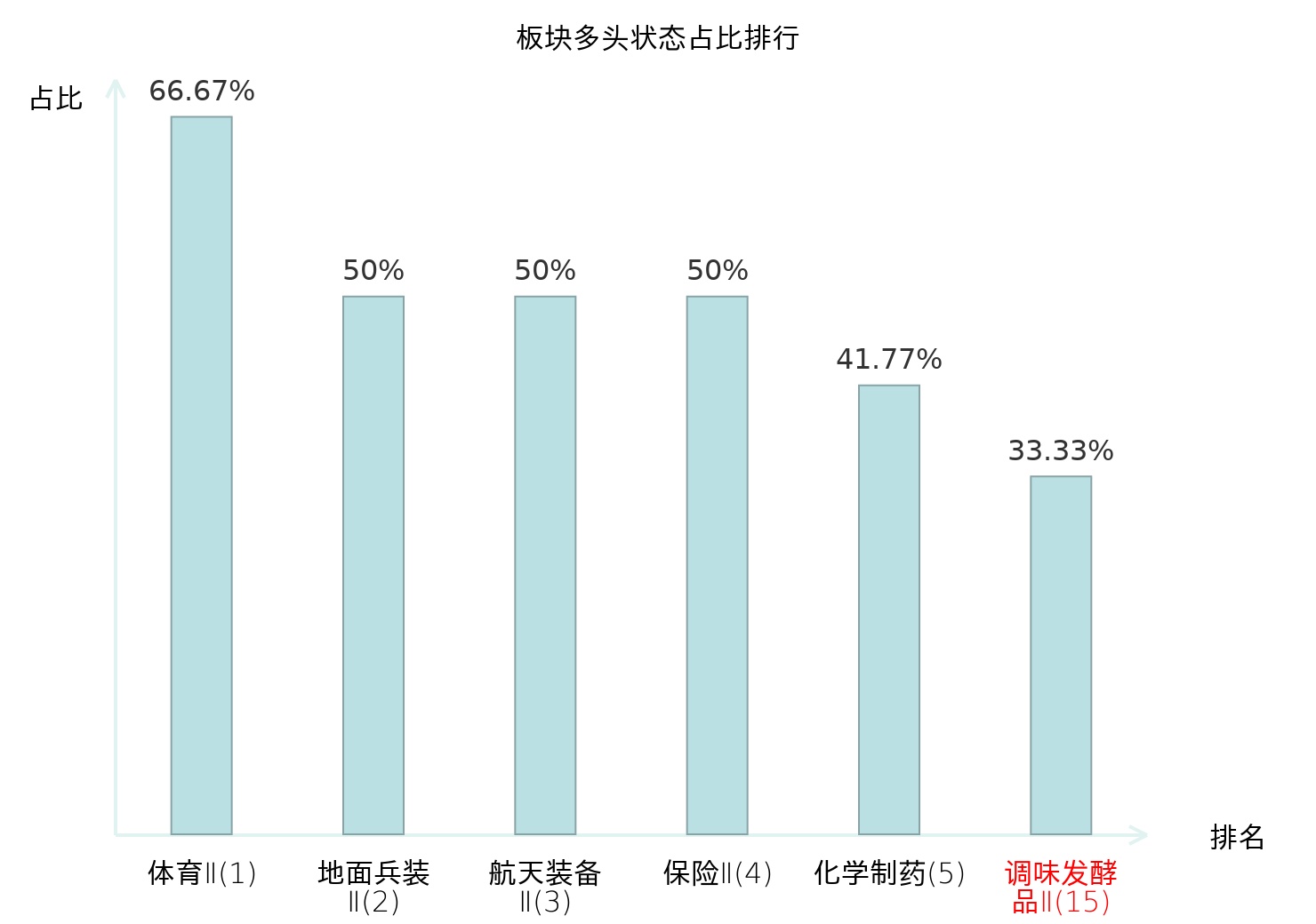 全市场所有行业板块中主力多头状态占比排名中,体育Ⅱ板块位居第一。普钢板块名次提升最快,较昨日上升98位。