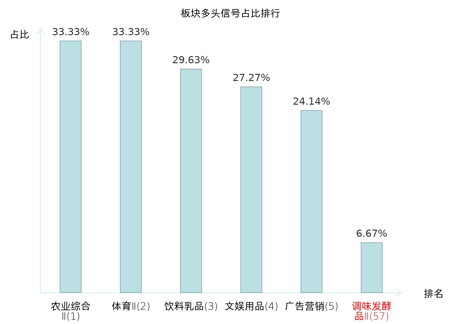 全市场所有行业板块中主力多头信号占比排名中,农业综合Ⅱ板块位居第一。体育Ⅱ板块名次提升最快,较昨日上升128位。