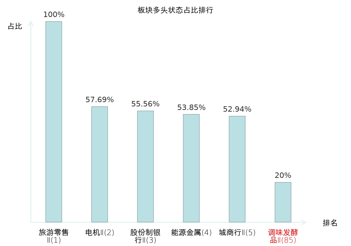 全市场所有行业板块中主力多头状态占比排名中,旅游零售Ⅱ板块位居第一。地面兵装Ⅱ板块名次提升最快,较昨日上升99位。