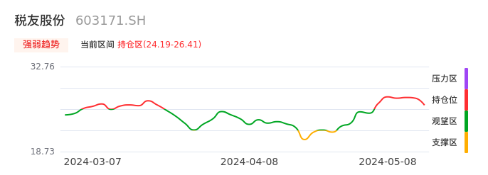 我们来看一下该股的九方特色指标强弱趋势的情况:税友股份自04月26日从观望区上穿到持仓区。股价近期在多头区域回调整理。后续重点关注多空分界点的争夺:24.19元。如未能有效站稳则可能重新回到空头行情。