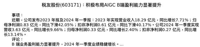 值得注意的是:2024年05月华创证券的吴鸣远分析师,首次发布关于税友股份的研究报告,标题为:税友股份(603171):积极布局AIGC B端盈利能力显著提升。