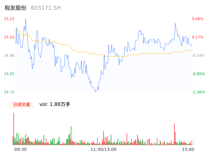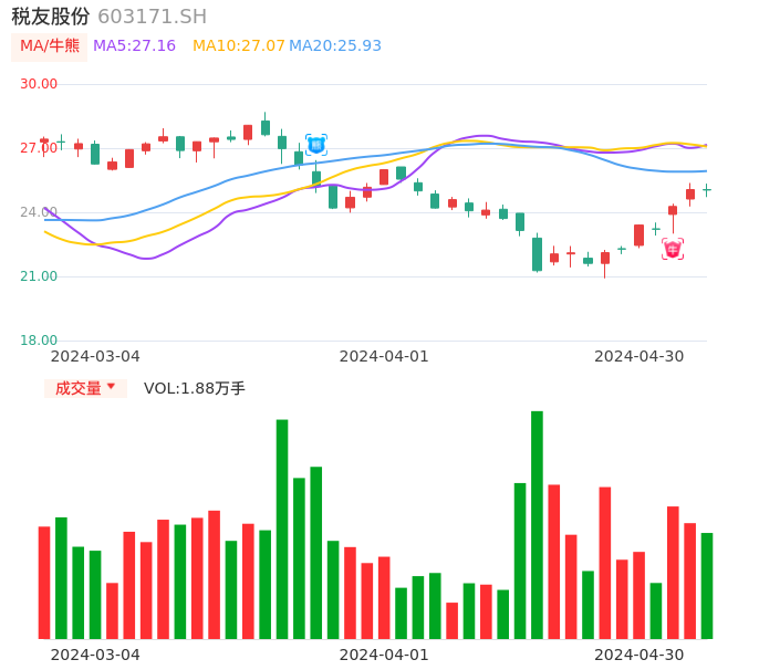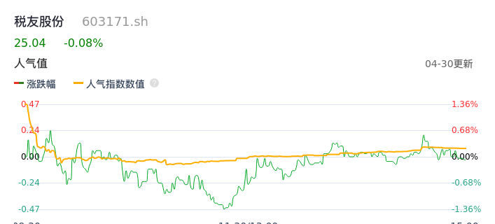 04月30日,税友股份收报25.04,股价涨幅-0.08%,成交金额4710.68万元,换手率2.08%。