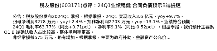 值得注意的是:2024年04月上海申银万国证券研究所的黄忠煌分析师,首次发布关于税友股份的研究报告,标题为:税友股份(603171)点评:24Q1业绩稳健 合同负债预示B端提速。