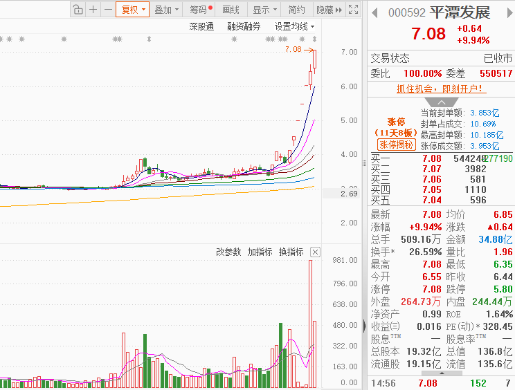 市场情绪:虽然指数表现萎靡,但上涨股票数量却接近3800只,今日全市场共57股涨停,连板股总数9只,37股封板未遂,封板率为60%(不含ST股、退市股)。焦点股方面,并购重组的时空科技晋级8连板,福建本地股平潭发展走出11天8板,瑞尔特与合富中国均录得4连板。
