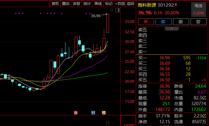 电池板块持续活跃,海科新源涨超14%创新高,天际股份2连板,中科电气、鹏辉能源、华盛锂电、恩捷股份、星源材质跟涨。