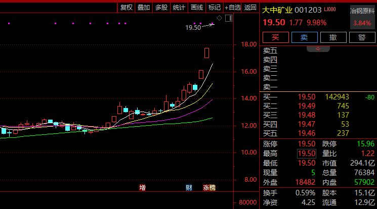 盘初,有色金属、黄金板块冲高,大中矿业3连板,湖南黄金触及涨停,华锡有色、白银有色、兴业银锡跟涨。