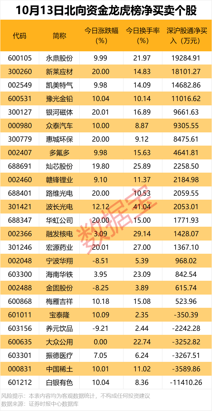 今日龙虎榜现身个股中,19股获北向资金净买入。净买入居首的是永鼎股份,金额为1.93亿元;新莱应材、凯美特气、豫光金铅均获净买入超1亿元。