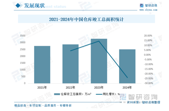 仓库主要为生产企业、贸易商、物流企业等提供货物的集中存放、库存管控、分拣、包装、配送衔接等服务,是现代物流体系中连接生产、流通和消费的关键节点,也是物流地产的重要组成部分。它与物流业、制造业、零售业深度绑定,是支撑实体经济高效运转的基础设施。近年来,随着电商的兴起和消费升级,物流行业取得快速发展,对仓库的需求也越来越大。因此,近年来,我国仓库竣工面积大幅增长,2023年我国仓库竣工面积为3296.12万m²,较2022年增加417.15万m²;2024年我国仓库竣工面积2508万平方米,同比下降24%;通用仓储总面积约为10亿m²,较2023年增加5.17亿m²,可租面积54898万m²,在建面积1722万m²,仓库园区40274个。