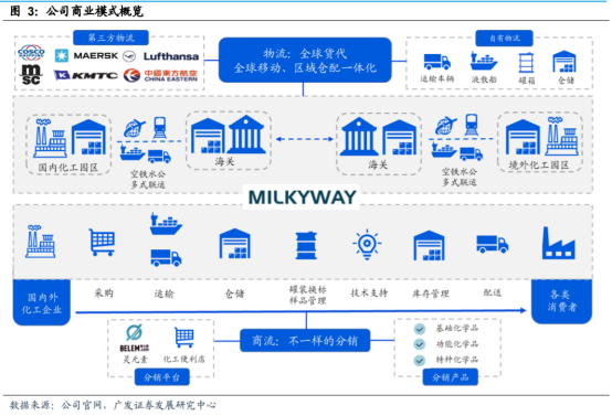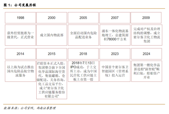 密尔克卫主营业务概述密尔克卫是国内领先的专业智能供应链综合服务商,提供以货运代理、仓储和运输为核心的一站式综合物流服务,并基于综合物流服务向化工品分销服务延伸,逐步形成的化工品及新能源行业物贸一体化服务;公司各板块服务环环相扣,互相协同发展,满足线上、线下不同行业、不同区域、不同规模的客户多样化的需求。