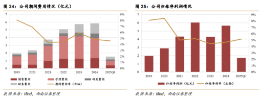 毛利率同比改善,费用率小幅增长。2025Q2公司毛利率为11.3%,同比增长0.4pct,或源于货代单箱毛利降幅低于运价降幅。费用率方面,2025Q2公司期间费用率为4.5%,合计增长0.2pct,其中销售费用率为1.1%,同比基本持平;管理费用率为1.9%,同比+0.2pct;研发费用率为0.3%,同比-0.3pct;财务费用率为1.3%,同比+0.2pct。2025Q2公司归母净利率为4.9%,同比-0.3pct。