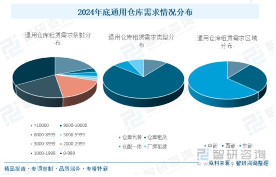 从仓库规模划分来看,2024年底,我国0-999m²的仓库需求最大,占33.33%;其次是大于10000m²与1000-1999m²的仓库,各占19.3%。从需求类型来看,仓库租赁占比达到75.44%;按区域分布来看,东部地区占据63.16%,东北地区暂无租赁需求。
