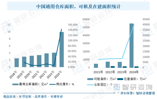 我国通用仓库面积一直保持增长趋势,据统计,2024年我国通用仓储总面积约为10亿m²,较2023年增加5.17亿m²,其中,可租面积54898万m²,在建面积1722万m²,仓库园区40274个。