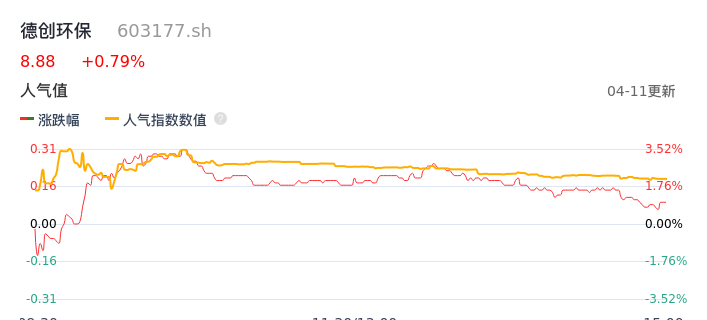 04月11日,德创环保收报8.88,股价涨幅0.79%,成交金额1926.92万元,换手率1.05%。