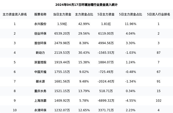 从主力资金流向来看,环境治理行业今日主力资金流入22.10亿元,在所有申万二级行业中排名:55/131。