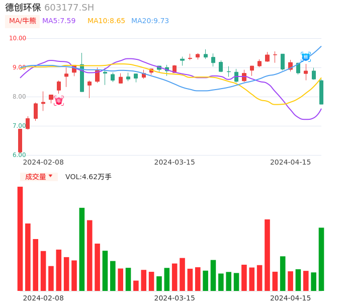04月15日,德创环保收报7.74,股价涨幅-10.00%,成交金额3639.39万元,换手率2.26%。
