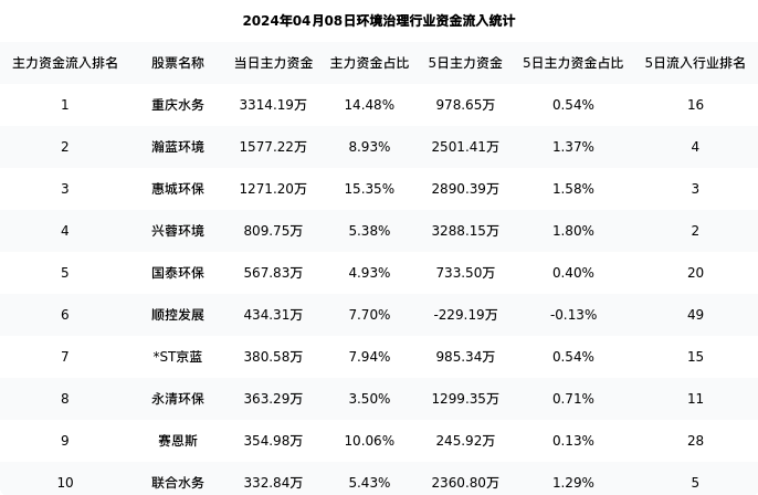 德创环保今日净流出129.89万元,主力占比4.78%,在行业内排名:49/104;5日净流出699.49万元,主力占比0.38%,在行业内排名:71/104。
