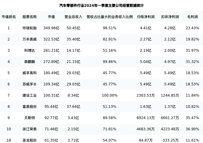 圣龙股份最新报告期数据为一季度,下表汇总了汽车零部件行业内市值靠前的公司一季度主要经营数据