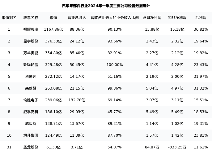圣龙股份最新报告期数据为一季度,下表汇总了汽车零部件行业内市值靠前的公司一季度主要经营数据