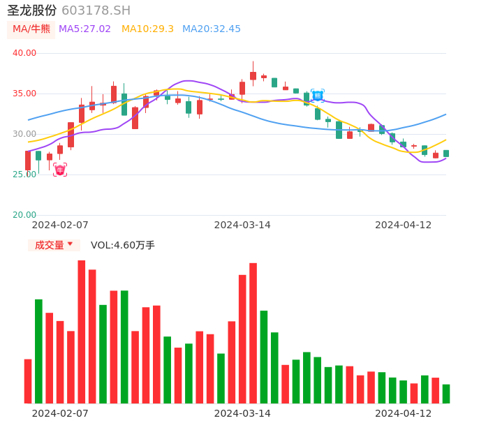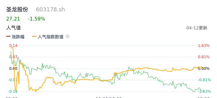 04月12日,圣龙股份收报27.21,股价涨幅-1.59%,成交金额1.26亿元,换手率1.94%。