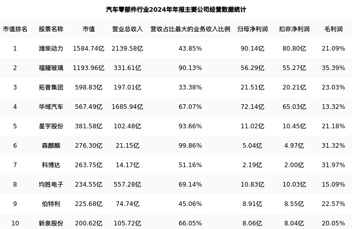 新泉股份最新报告期数据为年报,下表汇总了汽车零部件行业内市值靠前的公司年报主要经营数据