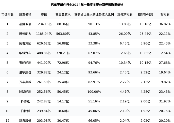 新泉股份最新报告期数据为一季度,下表汇总了汽车零部件行业内市值靠前的公司一季度主要经营数据