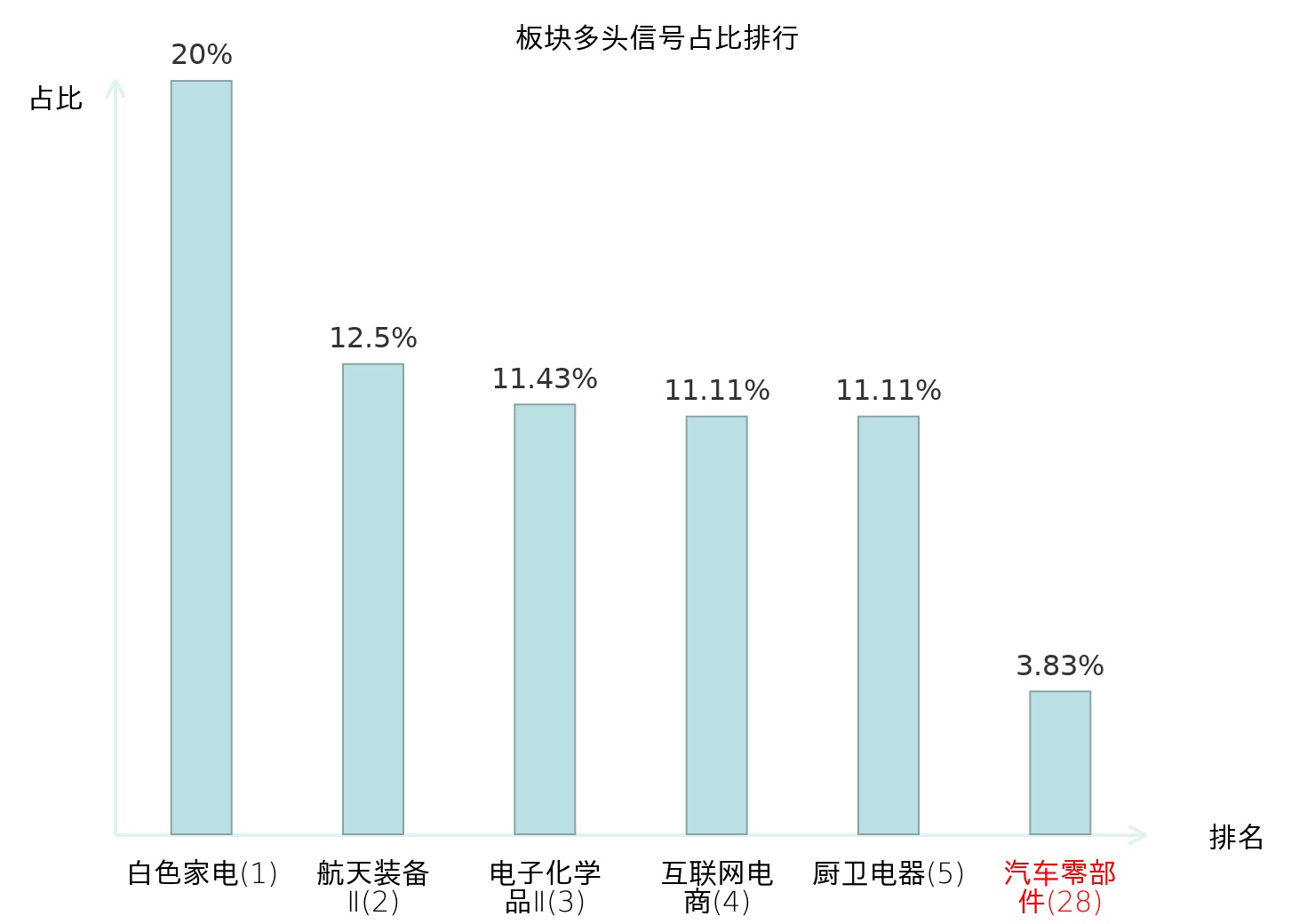 全市场所有行业板块中主力多头信号占比排名中,白色家电板块位居第一。航天装备Ⅱ板块名次提升最快,较昨日上升118位。