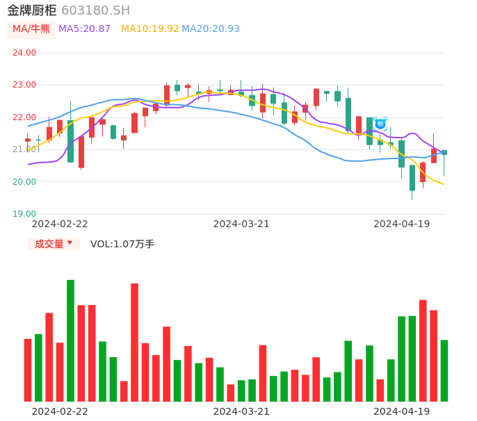 04月19日,金牌厨柜收报20.84,股价涨幅-0.86%,成交金额2190.16万元,换手率0.69%。