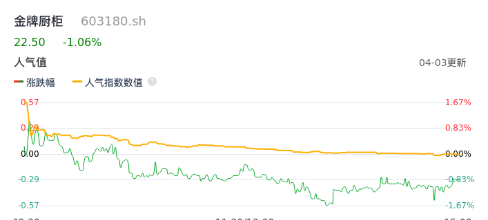 04月03日,金牌厨柜收报22.50,股价涨幅-1.06%,成交金额1508.32万元,换手率0.43%。