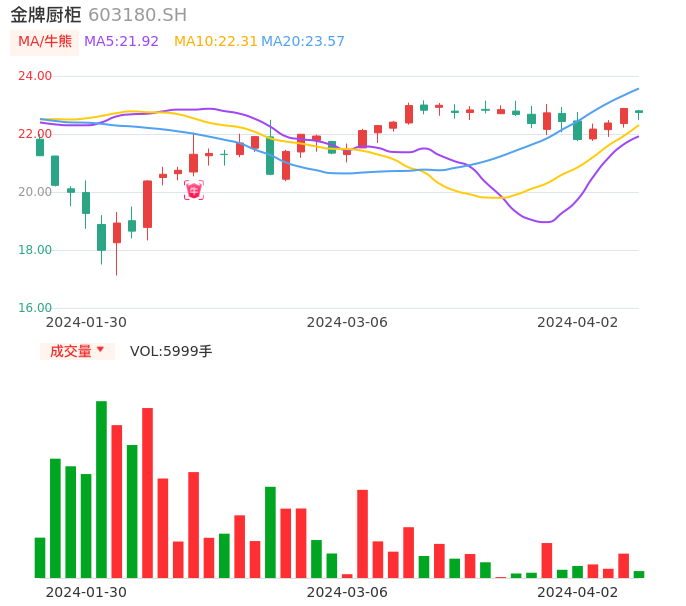 04月02日,金牌厨柜收报22.74,股价涨幅-0.61%,成交金额1359.85万元,换手率0.39%。